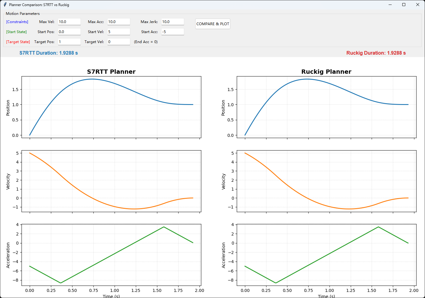 总的来说,S7RTT在单轴规划上应当比Ruckig更优,尤其是在目标速度为0的情况下可以做到100%最优解。但是,在多轴插补及目标速度、加速度不为0的规划中,ruckig仍然有优势。